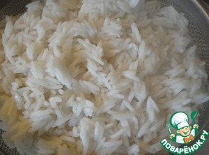 Рис заливаем кипятком (именно кипятком, т. к. он "заварит" крахмал на поверхности риса, и тот получится рассыпчатым)