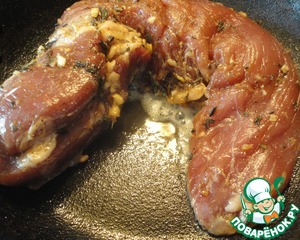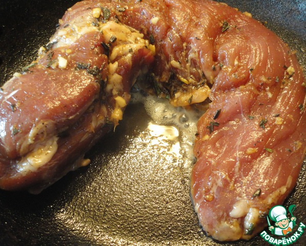 Обжариваем вырезку на сильном огне с двух сторон до образования корочки. Этот прием даст возможность сохранить сок внутри мяса.