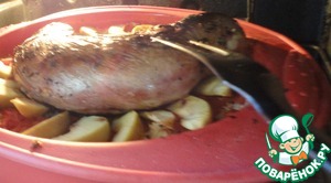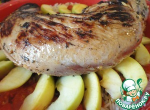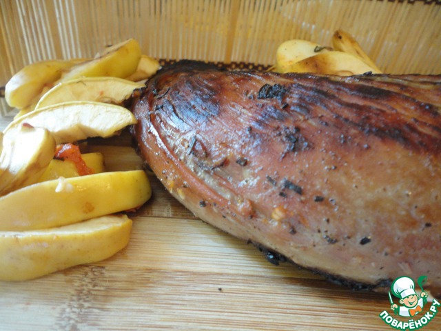 Ну, конечно, не могу не сказать о вырезке и яблоках. Мясо выходит необычно сочным и нежным. А яблоки за счет того, что были предварительно сбрызнуты лимонным соком, выходят хрустящими с легким ароматом меда (казалось бы, мед был только в маринаде, да и то немного, но яблоки, даже те, что не лежали под вырезкой - тоже его запахом пропитались). Те, кто любит мягкие яблоки - может лимонным соком не сбрызгивать.