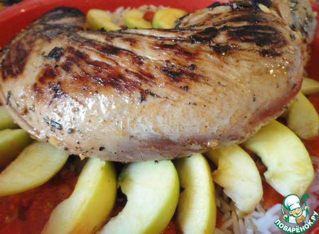 Переворачиваем рис на блюдо. Сверху выкладываем вырезку и яблоки.