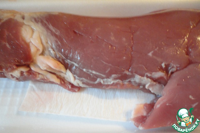 Вырезку вынимаем из маринада, обмакиваем бумажными полотенцами.