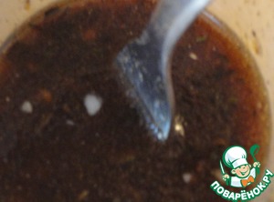 Кладем вырезку в целый полиэтиленовый пакет, заливаем маринадом.