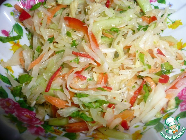 Не знаю, что мешало описать какие овощи режутся или что в миску высыпается то и то, и потом заливается тем и тем.