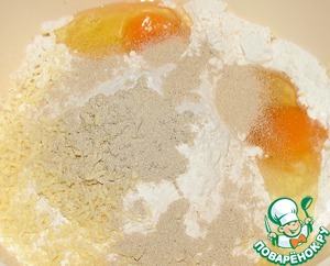 Муку просеять в глубокую миску. Разбить туда яйца, высыпать дрожжи и тёртый сыр.