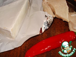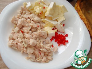 Сыр и курицу нарезать одинаковыми кусочками. Перец чили удалить семена и мелко нарезать. Смешать начинку.