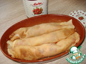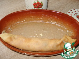 Свернуть в рулет и выложить в форму для запекания, смазанную сливочным маслом.