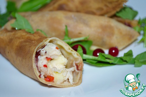 Клюква и курица - отменный дружественный союз. Для этого необязательно запекать курицу целиком, можно соединить их в одной начинке для блинчиков.