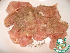Курицу нарезать, посолить, поперчить, добавить тимьян.