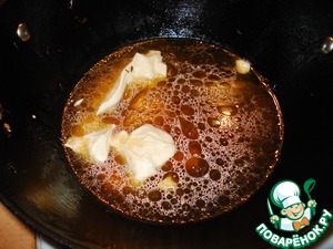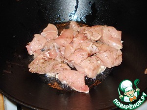 Разогреть растительное масло в сковороде (у меня вок) и обжарить курицу до золотистого цвета.