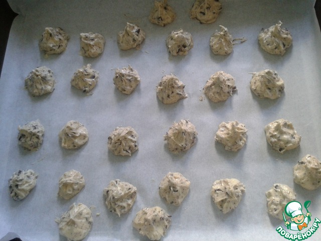 Духовку включаем на 160'. Противень застилаем бумагой, выкладываем маленькие округлые комочки смеси. Ставим в духовку на 15 мин.