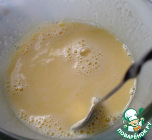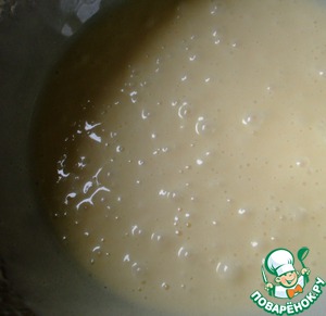 Желтки смешать с сахаром. Горячее молоко тонкой струйкой, при постоянном помешивании ввести в желтки.