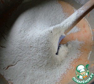 Добавить морковь, перемешать и просеять сверху мучную смесь. Аккуратно перемешать лопаткой до однородности. Не переусердствовать).