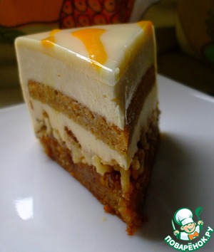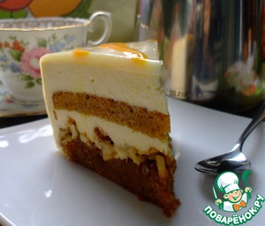 Распределить сырный мусс, сверху выложить первый морковный корж и покрыть его медовым муссом.