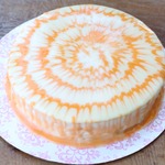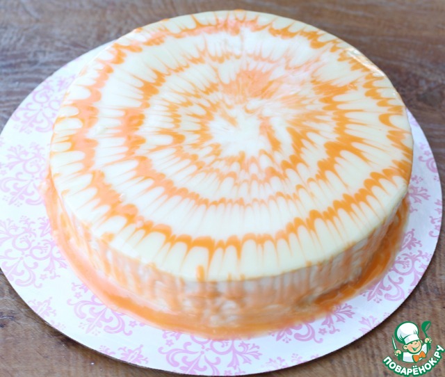 Глазировать вынутый из формы торт, затем с помощью кондитерского мешка нанести оранжевые полосы.