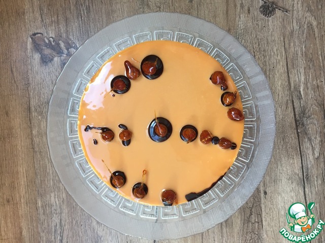 Убрать торт в морозильную камеру на 6-8 часов. Замороженный торт заглазировать зеркальной глазурью.»