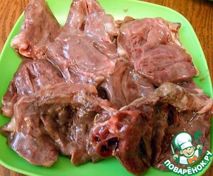 Замариновать в любом маринаде (у меня был лимонный соус) на пару часов. Время от времени перемешивать сердечки с маринадом. -