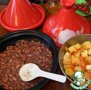 В сковороду тажина выложить консервированную фасоль вместе с жидкостью (или можно выложить замоченный на ночь горох или нут).