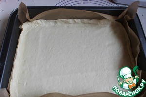 Берем глубокую форму. У меня 30х38 см, застилаем ее бумагой. Раскатываем 2/3 теста и выкладываем его в форму. Можно раскатать тесто прямо на бумаге и перенести его вместе с бумагой на лист. Бока завернем.