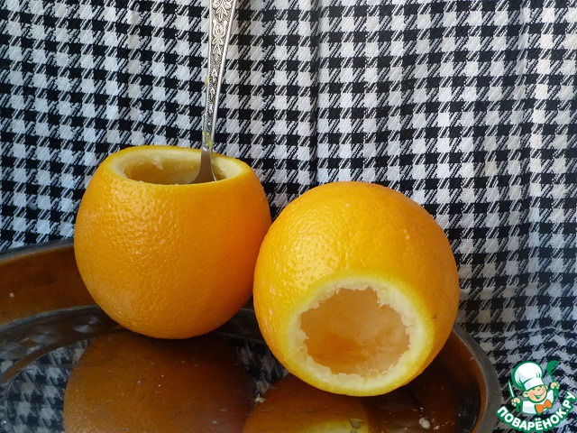 • Если всё же решите подавать десерт в апельсиновых "вазочках", то начинаем издеваться над апельсинами))) Отрезаем немного от верха и ложкой аккуратно вытаскиваем всё содержимое. Для салата внутренности апельсина не используем, но можно их превратить в сок, и с удовольствием выпить его.