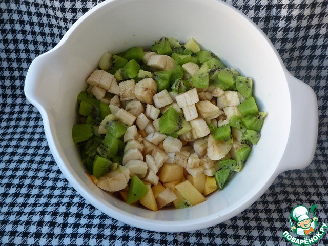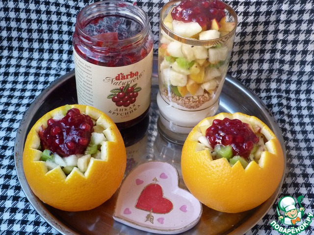 Рецепт «Фруктовый салат с творожным сыром и брусничным соусом»: