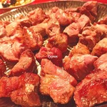 Шашлык нанизать на шампура, выложить на мангал и жарить на углях до готовности.