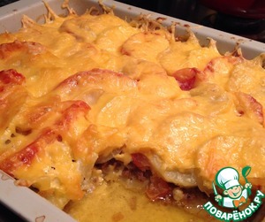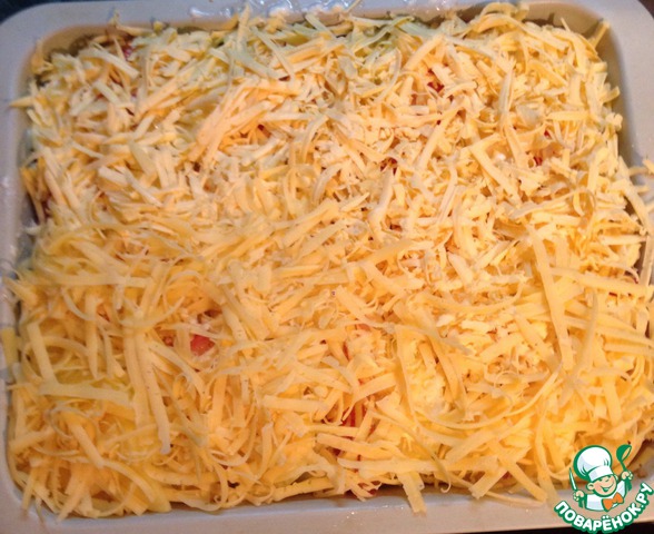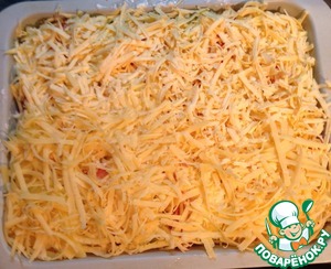 Присыпаем все сыром. Ставим в духовку на 45-50 минут на 180 градусов.