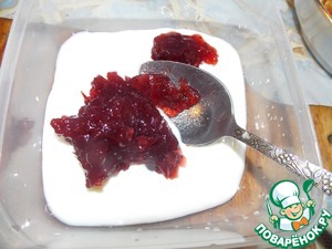 Делаем заправку для нашего салата. В йогурт добавляем клюквенный соус.
