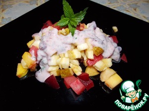 Сладкие фрукты в сочетании с заправкой из классического йогурта, клюквенного соуса и мяты. Очень вкусно и не калорийно, думаю, можно есть такой салатик даже перед сном.