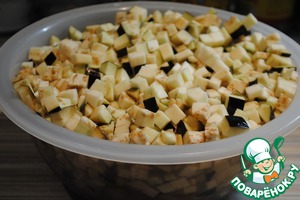 Баклажаны моем, режем кубиком примерно 1 х 1 см и помещаем в емкость с подсоленной водой на 15-20 мин.