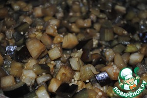 С баклажанов слить воду и обжарить на растительном масле (около 4 ст. л.). Обжаривать до мягкости, наши баклажаны уменьшатся в объеме примерно в 2 раза.