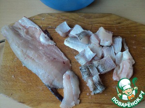 Рыбу разделываем на филе с кожей без костей и нарезаем на небольшие кусочки.