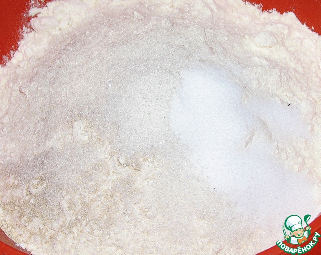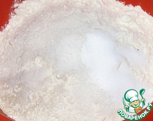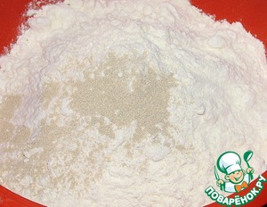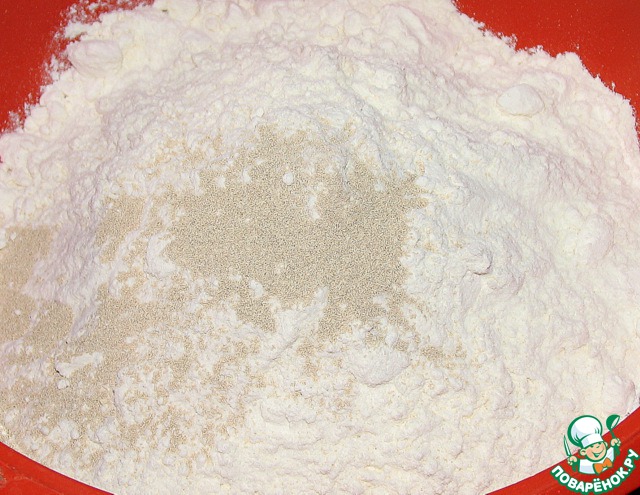 Муку просеять в глубокую миску и высыпать дрожжи.