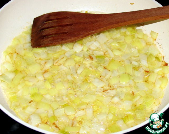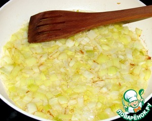 Для начинки хлеба спассеруем мелко нарезанный лук с тремя ложками масла до золотистого цвета.
