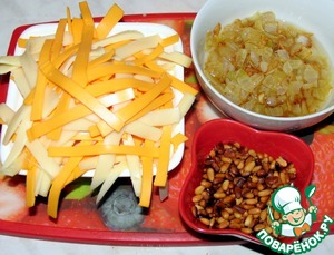 Ингредиенты для начинки хлеба - лук, орешки и сыр двух видов. Сыр я нарезала полосками.
