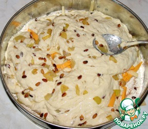 Часть теста выложила на дно, а на тесто чуть больше половины сыра.