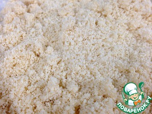 Смешать в блендере с лезвиями муку (200 гр), сливочное масло (150 гр) и сахар (90 гр). Должна получиться консистенция, напоминающая хлебные крошки.