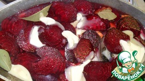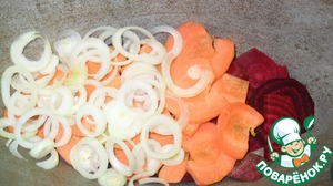 В глубокую кастрюлю (сотейник, гусятницу, лучше чугунную) выкладываем слоями сначала свеклу (плотно застилаем дно), потом морковь и лук. На фото показала слои нахлестом, но овощами заполняем всю площадь дна.