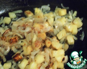 Лук и ананас почистить и нарезать кубиками, смешать и немного помять руками (для более активного выделения сока).