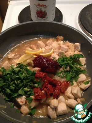 Теперь добавить лимон, зелень, вяленые томаты, клюквенный соус, довести до кипения, хорошо размешать, огонь поставить на минимум