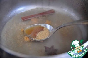 В небольшую кастрюльку налить белое сухое вино, насыпать коричневый сахар (хотя это не принципиально), положить палочку корицы, звёздочку бадьяна (в оригинальном рецепте была гвоздика, но я не стала её класть). Добавить сухой молотый корень имбиря.
