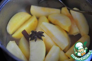 Положить в кипящее вино нарезанные яблоки, перемешать с сиропом, отставить с огня, накрыть крышкою и дать остыть.