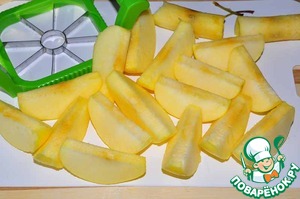 Яблоки помыть, удалить сердцевину, нарезать ломтиками, я использовала специальную фрукторезку.