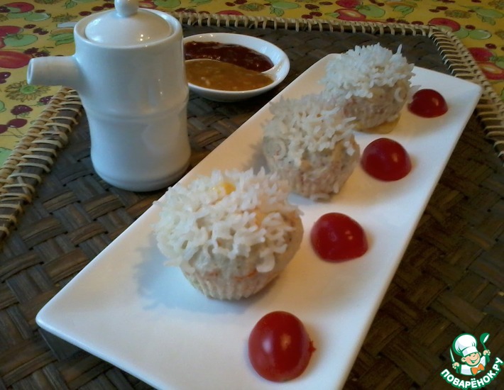 С риса слить воду. Хорошо обмакнуть одну сторону шарика в рис и положить в формочку для кекса. (Можно увеличить количество риса (взять100 г) и добавить его сразу в фарш, тогда кексики будут похожи на ежики).