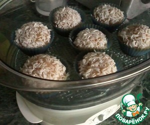 Если нет формочек, тогда рис добавить в фарш и шарики положить просто на мокрую решетку в пароварке.