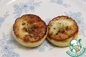 От яблока срезаем верх и низ, разрезаем пополам. Солим и перчим.