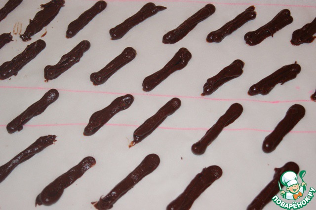 Застелить два противня размером 24Х32 см пекарской бумагой и с помощью кулинарного шприца или кулька отсадить полоски из шоколадной пасты с наклоном 30 градусов.