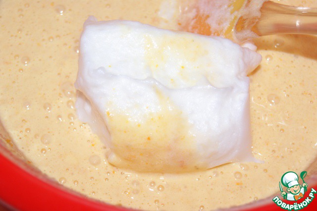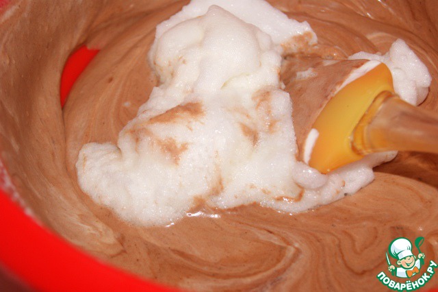 В два приема ввести взбитые белки, перемешивая лопаткой снизу вверх и по кругу -