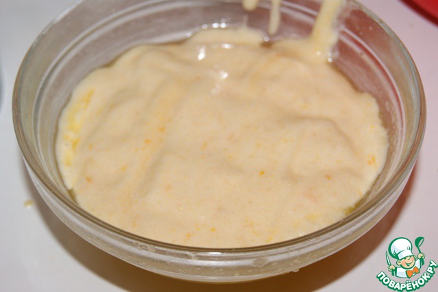 Взбить вместе 4 яйца, сахарную пудру 150 г и миндальную муку, добавить обычную муку 150 г и цедру 2 ч. л. (или оранжевый краситель), перемешать лопаткой.