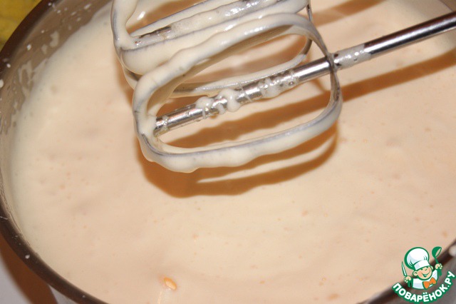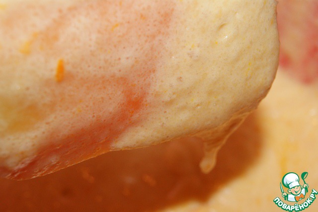 Соединить взбитые яйца с апельсиновым соком, в котором разведен желатин и сливками. Перемешать.