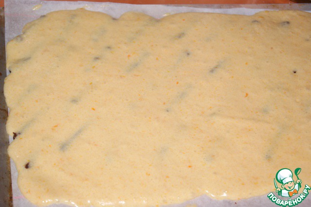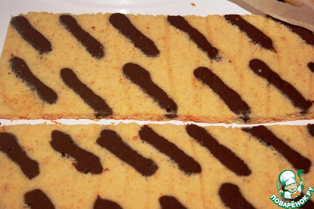 Достать противни с шоколадными полосками из холодильника и нанести на них сверху тесто Джоконда.
